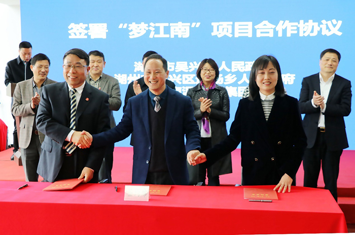 吳興區(qū)副區(qū)長朱建忠,道場鄉(xiāng)黨委副書記、鄉(xiāng)長王亞琪和金洲集團(tuán)、云南湄公河集團(tuán)事長俞錦方簽署“夢江南”項目合作協(xié)議。