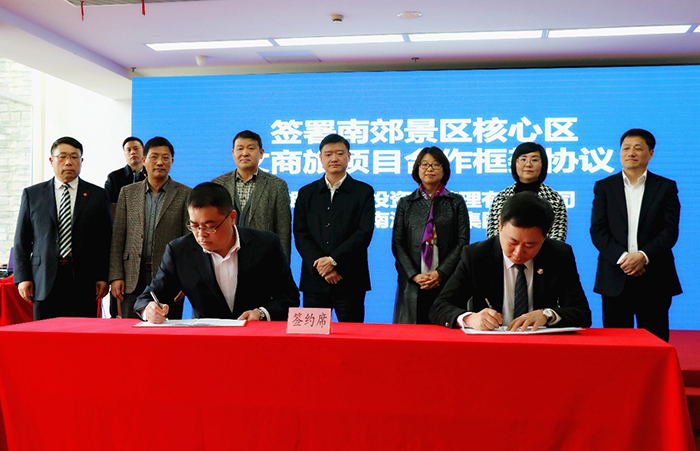湖州市城投資產(chǎn)管理有限公司董事長吳劍與云南湄公河集團(tuán)總經(jīng)理鮑建斌簽署南郊景區(qū)核心區(qū)文商旅項目合作框架協(xié)議。